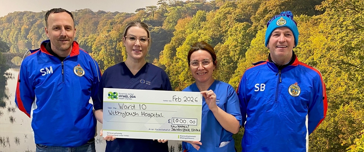 Dywedodd Katie Hancock, Swyddog Codi Arian: “Diolch yn fawr iawn i Simon, Stuart a phawb yng Nghlwb Pêl-droed New Hedges Saundersfoot am ddewis Ward 10 fel un o fuddiolwyr eich noson elusennol. Mae eich haelioni yn deyrnged hyfryd i Gareth, ac mae'r rhodd yn cael ei gwerthfawrogi'n fawr gan y tîm ar Ward 10. Rydym mor ddiolchgar am eich cefnogaeth anhygoel.