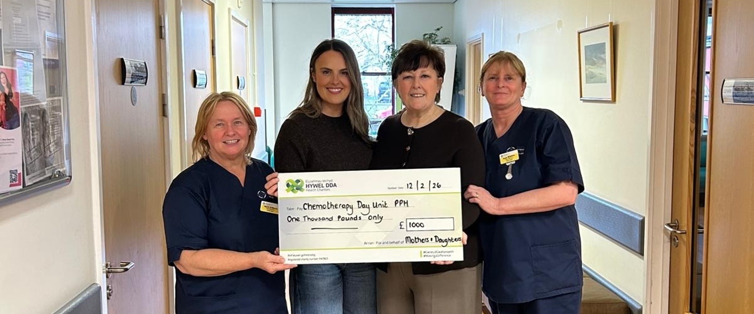 Dywedodd Kath Watkins, Prif Nyrs, Uned Ddydd Cemotherapi: “Ar ran y staff a'r cleifion yn yr Uned Ddydd Cemotherapi yn Ysbyty Tywysog Philip, hoffwn ddiolch iddynt am eu hymdrechion codi arian a arweiniodd at rodd hael iawn o £1,000.