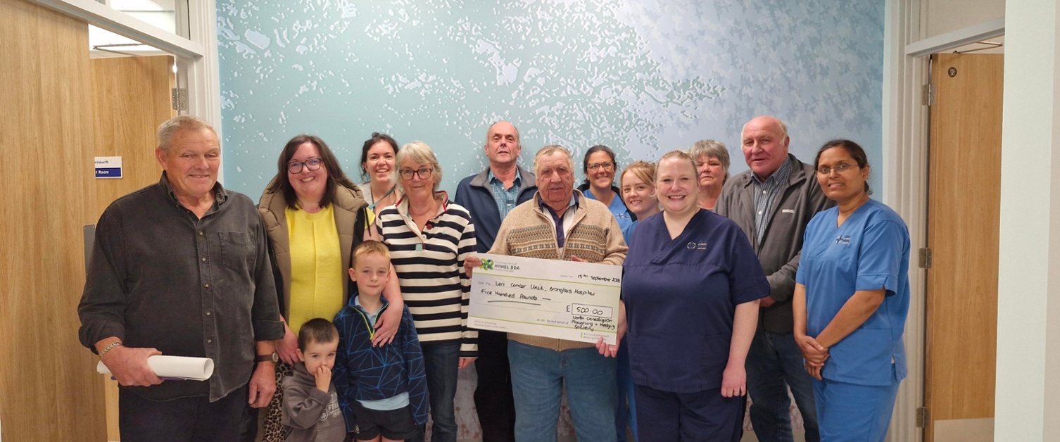 Yn y llun uchod: Aelodau o Gymdeithas Aredig Gogledd Ceredigion gyda staff o'r uned gemotherapi.