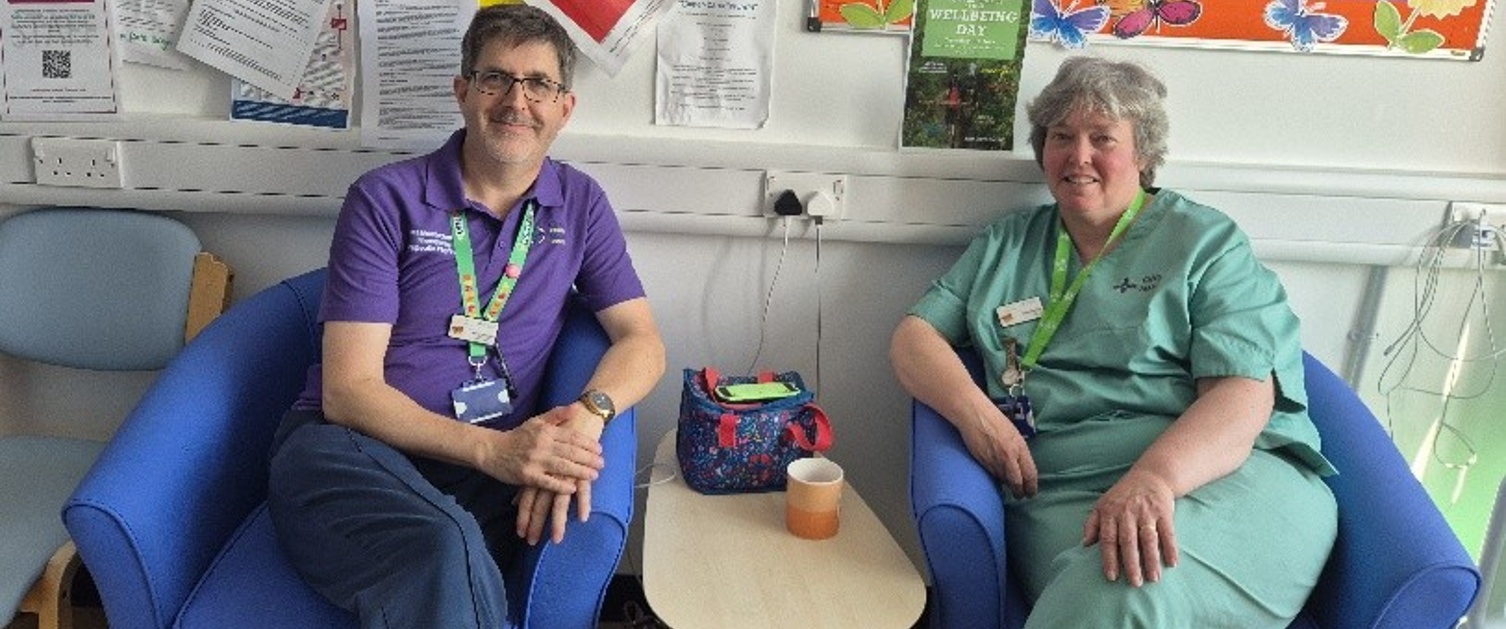“Mae’r cadeiriau newydd hyn yn cael eu defnyddio gan ein staff yn ystod egwyliau a throsglwyddiadau ac yn ein galluogi i gefnogi ein staff trwy ddarparu mannau addas iddynt gymryd egwyl i ffwrdd o’r ward.”