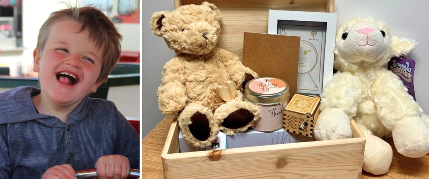 Chwith: Frankie “hardd, anhygoel, gwych, cariadus a dewr”, a oedd yn derbyn gofal gan dîm Gofal Lliniarol Pediatrig Hywel Dda, ac ar y dde: blwch atgofion i deuluoedd, a ariannwyd gan y Gronfa Ddymuniadau